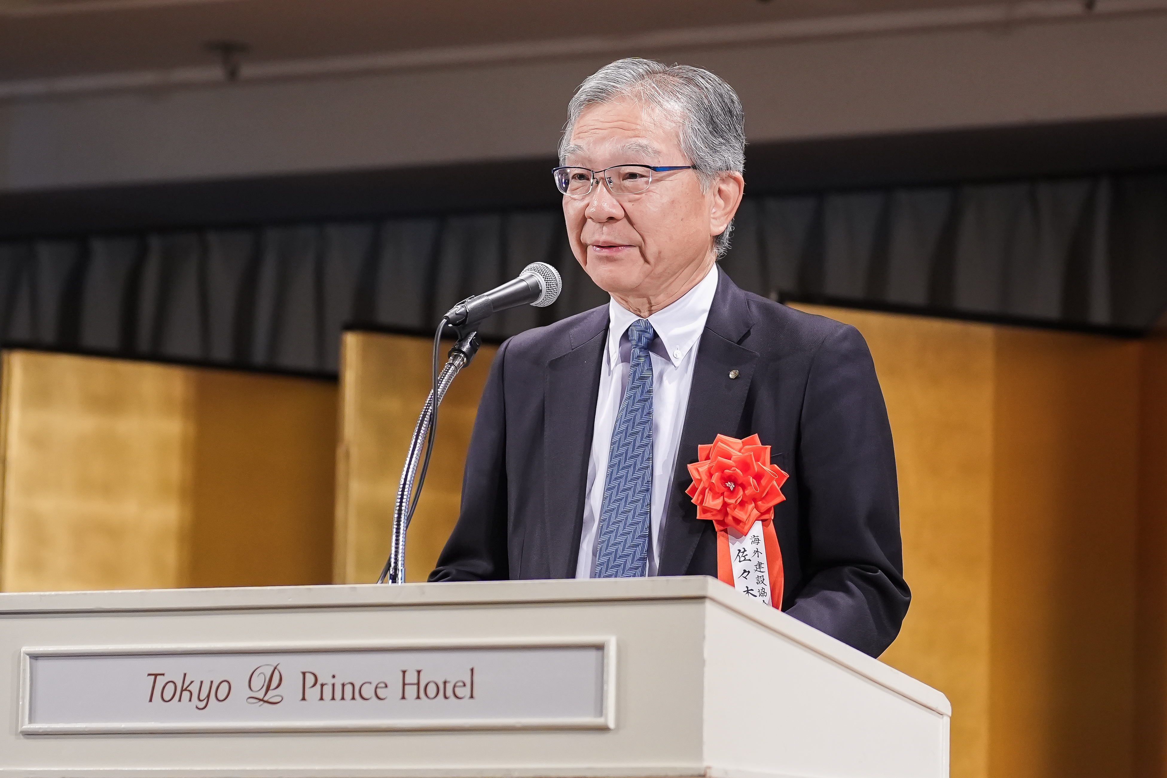 表彰式では、佐々木正人 海建協会長より主催者代表挨拶、国土交通省 藤田昌邦 官房審議官(不動産・建設経済)より来賓祝辞、学校法人関東学院 規矩大義 理事長より表彰選考委員会委員講評が行われた後、受賞者に表彰状及びクリスタルトロフィーが授与されました。表彰後、受賞者を代表して清水建設株式会社 土木国際支店 土木部 酒井貴之 主席マネージャーより挨拶が行われました。